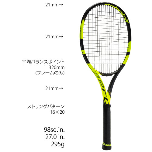 フェイス面積98平方インチ フレーム厚21mmフラット 長さ27inch 平均重量平均295g バランス平均320mm グリップサイズG2/G3 ストリングパターン16×20 適正テンション50-59ポンド 素材グラファイト 機能1アエロモジュラーテクノロジー 機能2ウーファーシステム 付属品専用ラケットケース付(ハード) 発売日2016年10月 ステンシルステンシルマークは入っておりません。