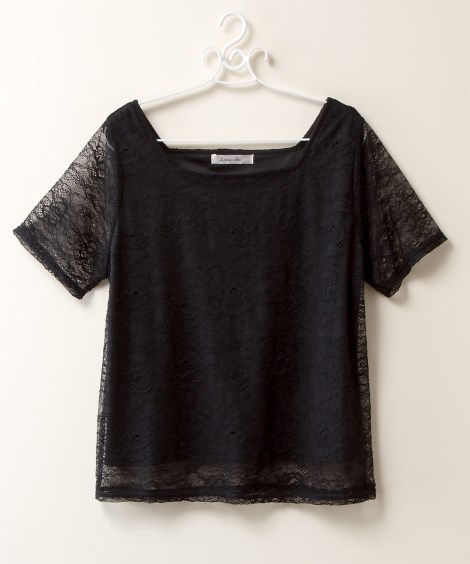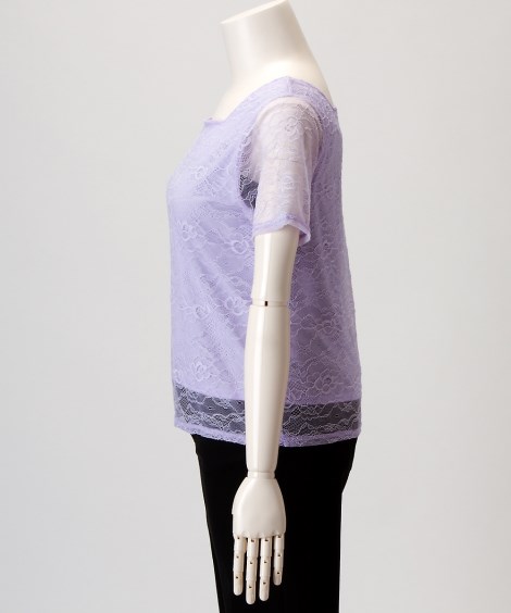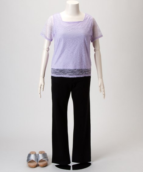 Tシャツ カットソー 大きいサイズ レディース スクエアネックレース プルオーバー 薄手素材 ブラウス ラベンダー/黒 LL/3L ニッセン